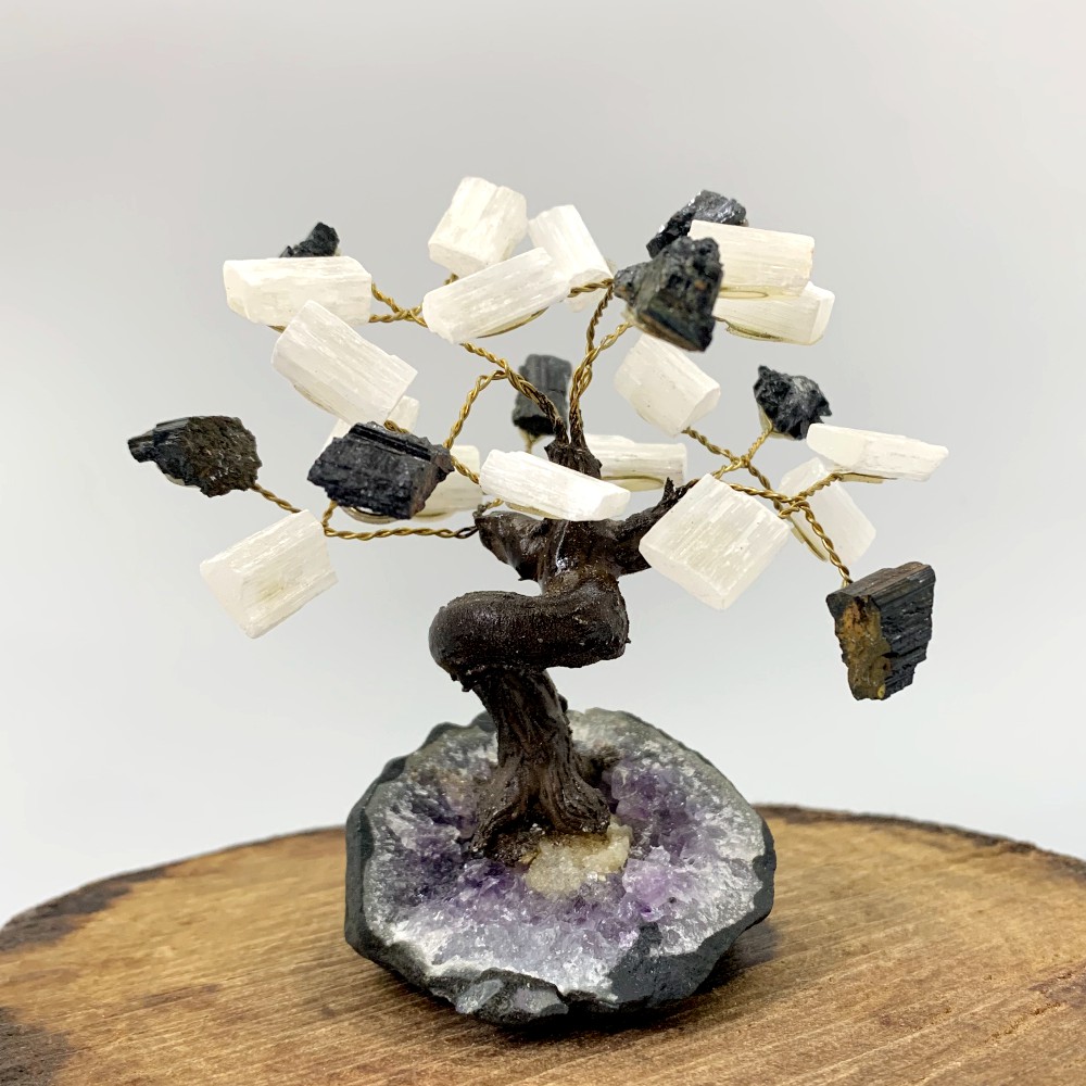 ÁRVORE DE CRISTAIS – SELENITA, TURMALINA NEGRA COM BASE DE AMETISTA