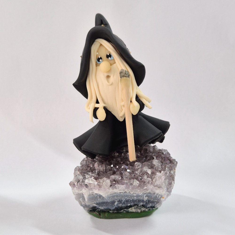 Esta peça única une a força mística do mago com a poderosa energia dos cristais, criando um verdadeiro amuleto de sabedoria, proteção e manifestação.